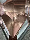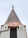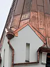 – Vi har tekket hele tårnet og brukt 440 cc mellom falser, 1920 mm i lengde. Det er laget en spesiell sving med kinesisk vipp i falsene. I tillegg har laget en ny kule som er 400 mm i diameter, også den i kobber. Vi har laget håndlagde renner, overknekk, utkast, og rennevinker. Totalt er det 30 meter med renner og 90 meter med nedløp. Vi har også laget spillrenner og veggbeslag. En god del av delene er laget på eget verksted, sier Svein Hanssen i Hellberg & Bjerkeli.