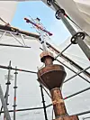 Det var en luftig jobb for blikkenslagerne. Det er 40 meter til toppen av spiret og selve tårnet er alene hele 17 meter høyt. Stillasbyggerne brukte to måneder bare på å bygge stillaset. Det har vært heis opp til 20 meter og trapper resten av høyden.
